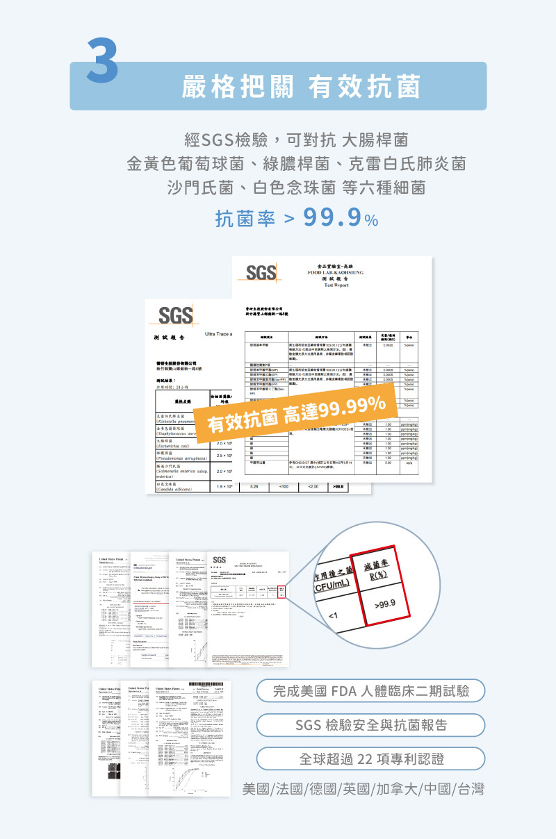 💧經SGS檢驗,抗菌率>99.9%,能對抗日常生活6大細菌